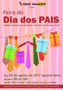 //A Assutef-CT colocará novamente à disposição de seus associados, a sua estrutura e recursos para a realização de uma Feira do Dia dos Pais. Na ocasião, estarão sendo comercializados itens e produtos para comemorar a data. A feira acontecerá no dia 09 de agosto (quarta-feira), das 9h às 18h, no pátio central, na Sede Centro do Câmpus Curitiba. As inscrições podem ser realizadas de 31 de julho a 08 de agosto. Para consultar o regulamento, ter mais informações e realizar sua inscrição, procure a Sede Administrativa.